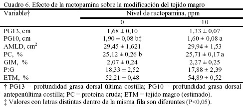 Para la PG10 no se observó efecto entre el nivel de RAC y el sexo; sin embargo, hubo un efecto (P<0,001) de la RAC sobre la PG10 con una disminución este valor en 0,30 cm en los animales tratados (Cuadro 6). Esto coincide con las observaciones de Dunshea et al. (1993), Crome et al. (1996) y Schinckel et al. (2003).