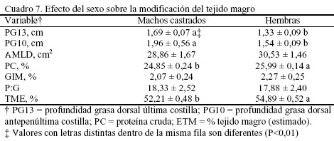 Igualmente se observó un efecto (P<0,001) del sexo sobre la PC, en donde las hembras mostraron un incremento de 1,14 unidades porcentuales con respecto a los machos castrados (Cuadro 7). Estos resultados son coincidentes con los reportados por Weatherup et al. (1998). Es posible que este efecto se encuentre vinculado a la baja acción androgénica en los machos castrados, lo que conlleva a una disminución de la síntesis proteica (Lopes et al., 2001).