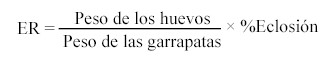 Con los datos del peso de cada garrapata, el peso de la masa de huevos producidos y el porcentaje de eclosión, se calculó la eficiencia reproductiva (ER), valor que expresa la capacidad de una teleogina para transformar su peso corporal en larvas viables. La ER es un valor necesario para calcular la eficacia del acaricida. Se utilizó la fórmula siguiente (Drummond et al., 1973):