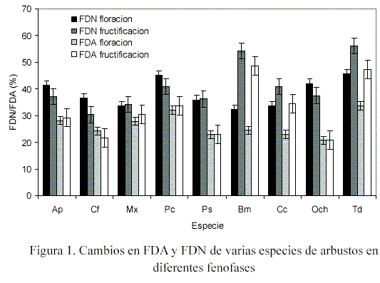 Para la etapa de floración, se determinó la FDN encontrando los mayores valores en Td y Pc con 45,7 y 45,2%, respectivamente, mientras que el la fase de fructificación, las especies Td y Bm obtuvieron valores de 56,1 y 54,2%, respectivamente (Figura 1). La FDA en floración las especies Td y Pc con 33,7 y 32,1%, respectivamente, obtuvieron los mayores valores, mientras que en la fase de fructificación, las especies Td y Bm reportaron valores de 48,7 y 47,4%, respectivamente. En la Figura 1 se observan las variaciones entre las distinta especies. Estos resultados señalan que las especies Ap, Pc, Bm, Och, Cc, Td presentaron diferencias estadísticas con Cf, Mx, Ps (P<0,01) y en las fenofases Bm, Cc, Och y Td fueron diferentes (P<0,05). En base a estos principios se han desarrollado índices de valor potencial (Lozano et al., 2002) que estiman el tiempo de masticación y/o rumia por kg de materia seca (MS) y que han servido de base para la fibra detergente neutro efectiva (FDN-e). Se recomienda para mantener el llenado ruminal y condiciones fermentativas adecuadas, que 80% de la FDN se proporcione en forma de FDN-e, o bien 22,4% de la FDN-e en porcentaje de la MS ingerida.