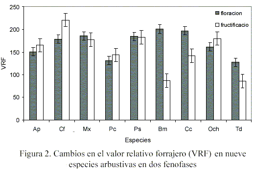 Los valores relativos forrajeros potenciales se presentan en la Figura 2, obteniendo las especies Bm (201) y Cc (196) con el mayor índice para la época de floración, mientras que la especie Td obtuvo el menor VRF con 131. Para la época de fructificación fueron las especies Cf (220) y Ps (182), mientras que la especie Td (86) volvió a mostrar el menor índice. Estos resultados fueron influidos por la digestibilidad y el índice de consumo que presentaron tendencias que propician el potencial valor relativo forrajero de cada arbusto, que coinciden con los trabajos realizados en otras fenofases con este mismo material vegetativo (Hernández et al., 2006), variando los rangos de digestibilidad durante la floración entre 62 y 73% y durante la fructificación entre 50 y 71%. La especie Td durante la floración y fructificación presentó los menores valores con 62,6 y 51,7%, respectivamente. Las especies Bm y Cf presentaron los valores más elevados con 69,9 y 71,9%, respectivamente. La misma tendencia se observo para el índice de consumo donde la especie Td obtuvo el menor valor para ambas fenofases con 2,62 y 2,13, mientras que los mayores índices de consumo los obtuvieron Bm y Cf con resultados de 3,71 y 3,94, para floración y fructificación, respectivamente.
