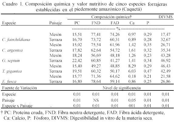 En general, se encontró una alta variabilidad (P<0,01) en la composición química y digestibilidad in vitro debido a la especie y al sitio en que se sembraron (Cuadro 1). Entre las especies, T. gigantea sobresalió por su alta calidad, la cual presentó los mayores valores de DIVMS y Ca (44,46 y 7,16%, respectivamente), los menores contenidos de FND (54,7%) y FAD (49,5%). Entre sitios, en el mesón se observo un menor contenido de PC, mayor concentración de (FAD y una menor DIVMS, comparado con el suelo de terraza. En el suelo de mesón el contenido de PC varió entre 15,2 y 18,24% y entre 16,7% y 22,42% en terraza. También se encontró una amplia variación de DIVMS de suelo de mesón, con un rango entre 17,47 y 46,43%, mientras que en el suelo de terraza el rango estuvo entre 26,86 y 46,92%. El contenido de fibra también fue variable entre especies y al sitio en el cual se sembraron. La FND en el suelo de mesón vario entre 49,3% para T. gigantea y 78,6% para E. fusca, mientras en el contenido de FAD varió entre 41,3% para G. sepium y 74,3% para C. fairchildiana. Minson (1990) reportó que los forrajes con altas concentraciones de fibra son digeridos lentamente en el rumen y su aprovechamiento máximo requiere de varios días o semanas, por lo que se podrían explicar los bajos valores de DIVMS.