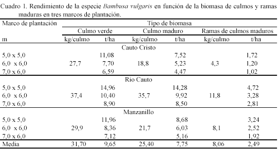 Estos resultados de Bambusa vulgaris en nuestras condiciones, superan lo reportado para dicha especie en otros países, donde se conoce que en los bosques naturales de bambú en la India, en general, se llegan a tener rendimientos de 2,5 a 4,0 t/ha y con un manejo forestal conveniente su rendimiento se eleva hasta 6 a 7,5 t/ha (Ordóñez, 1999). El rendimiento de los bambúes, teniendo como componente esencial la biomasa, es una variable que depende de muchos factores, donde la especie y las condiciones de sitio pueden ejercer influencias significativas.