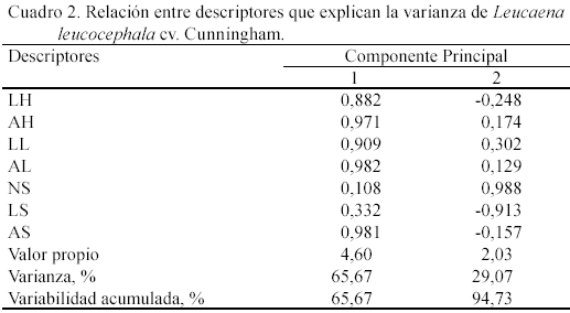 En la leguminosa (Cuadro 2), todos los descriptores se relacionaron con el CP1, excepto NS y LS que se relacionaron con el CP2 y en el CP1 los indicadores se relacionaron de forma positiva, no siendo así en el CP2 en la cual el indicador LS se relacionó de forma inversa con NS. Esta alta variabilidad denota que existió una aceptable variación para muchos de los descriptores utilizados en la actividad de caracterización morfobotánica de estas especies, lo cual es un buen síntoma de la riqueza intravarietal que existe en las poblaciones de estas especies, particularmente después de haber transcurrido un periodo de 10 años de explotación. No obstante, es importante denotar que a pesar de que estos potreros fueron sometidos a un régimen de explotación con animales a través de un manejo especifico, sin riego y sin fertilización, las especies mantuvieron su población estable y no declinaron en términos de los indicadores morfológicos ya que los rangos encontrados en los descriptores botánicos están entre los reportados en la literatura (Hughes, 1998), lo que reafirma sus características positivas como variedades comerciales.