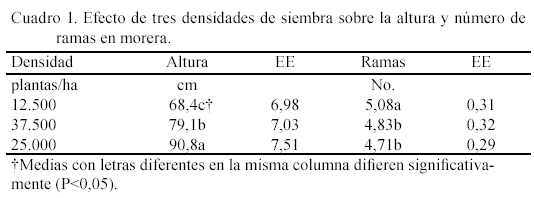 With the objective of determining the effect of planting density on the initial growth of mulberry, during the establishment stage, three planting densities were studied: 12500, 25000, and 37500 plants/ha. For this a completely randomized design was used. The period of evaluation was 10 months. Five plants were randomly selected in each plot and the height and number of branches were measured monthly. For data analysis a factorial design was used. For the variable height statistical differences were observed (P<0.05) among densities. With the density of 25000 plants/ha the highest height was reached (90.8 cm), as compared to the other two densities (79.0 and 68.4 for 37500 and 12500 plants/ha, respectively). Regarding the number of branches, the highest values were found when using the lowest planting density (12500 plants/ha). It is concluded that the highest plants were obtained with the density of 25000 plants/ha, while that planting at densities of 12500 plants/ha, higher branch numbers were obtained. To continue the study during the exploitation stage of the crop is recommended, with the objective of evaluating the influence of this factor on the yield and bromatological composition of the plants.