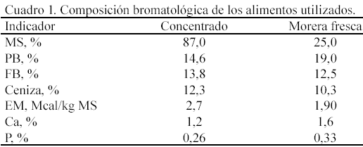 Para evaluar el comportamiento productivo de los cerdos en ceba se utilizó un total de 16 animales de ambos sexos, hembras y machos castrados, divididos en dos grupos homogéneos, con un peso vivo promedio inicial de 30 kg. El tiempo de estudio fue cinco meses. Para el grupo control la dieta empleada fue concentrado comercial (Cuadro 1), según la norma NRC (1988), mientras que en el grupo experimental se sustituyó entre 27 y 30% de la proteína del requerimiento total en forma follaje de morera fresca. El suministro de follaje fue controlado para mantener la proporción prevista y siempre se hizo en horas de la tarde (14:00 horas).