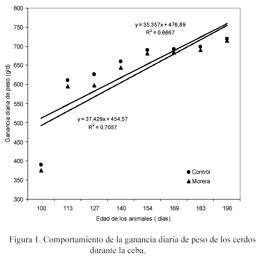 El aumento en el peso promedio de los cerdos en ceba del grupo control respecto al grupo experimental (que consumió morera) no presentó diferencias significativas, aunque se detectó un ligero incremento numérico en aquellos animales que solo consumieron concentrado. Los grupos iniciaron y terminaron las etapas de evaluación con pesos promedios muy próximos (63,02 vs. 60,59 kg) y la diferencia en el incremento total del peso vivo durante la etapa evaluada en ceba fue pequeña (2,43 kg/cerdo). Este valor diferencial coincide con lo reportado por Muñoz (2003).