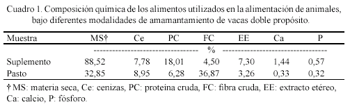 El valor promedio de la biomasa forrajera presente en los potreros de pastoreo fue 2.905 kg MS/ha, la cual se considera adecuada, ya que estuvo por encima del valor crítico de 2.000 kg MS/ha señalado por Minson (1990) ó de 1.000 1.500 kg MS/ha indicado por Noy-Meir (1975) y González (2002). El promedio de biomasa forrajera a entrada y salida de los potreros fue 2.974 y 2.833 kg MS/ha, respectivamente. Los resultados obtenidos en relación a la composición química de los alimentos utilizados (pasto y suplemento alimenticio) se presentan en el Cuadro 1. Debido a que las cantidades de forrajes disponibles y la composición bromatológica de los alimentos utilizados estuvieron dentro de los parámetros alimenticios y nutricionales recomendados para producción de leche con vacas de doble propósito de mediano potencial genético (Combellas, 1998) no se consideró éste como un factor limitante para afectar la expresión de los efectos de los tratamientos sobre las variables evaluadas.