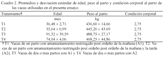 Las variables relacionadas con grado de reservas corporales, tales como peso y condición corporal al parto, al ser estadísticamente iguales (P>0,05) a inicio del experimento se consideraron con igual efecto sobre los tratamientos evaluados (Broster y Broster, 1998; Jerez, 2002). El promedio de pesos y condición corporal al parto fue 457,6 kg y 2,75, respectivamente. Los valores promedios por grupo animal, es decir, de acuerdo al número de partos se aprecian en el Cuadro 2, donde también se incluyen los valores de la edad promedio y desviación estándar por tratamiento, siendo el valor global 56,8 meses. Específicamente, en el caso de los valores obtenidos para edad de las vacas de primer parto, éstos se encuentran dentro de los descritos por Hahn (1988) y Noguera et al. (1994) con 54,9 y 44 meses, respectivamente, a nivel nacional y de rebaños cruzados en el Sur del Lago de Maracaibo.