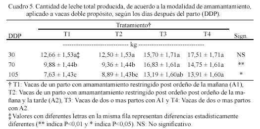 En cuanto al número de partos, los datos obtenidos coinciden con los reportados por Pérez y Gómez (2005), al observar que la producción de leche aumenta gradualmente con la edad, siendo que las vacas con un mayor número de lactancias producen mayores cantidades de leche. Así, el solo hecho del cese del crecimiento que se presenta en el animal adulto, dirigirá los nutrientes disponibles directamente hacia la mayor síntesis láctea, apoyado en el desarrollo pleno de la glándula mamaria de la vaca adulta que garantiza una mayor cantidad de tejido secretor (Pérez y Gómez, 2005). El estudio demostró que, según la etapa de la lactancia, se pueden esperar incrementos en producción de leche desde 25% (30 DDP) hasta 82% (105 DDP), según el tratamiento de evaluación, siendo siempre que los tratamientos T3 y T4, produjeron la mayor cantidad de leche (Cuadro 5).