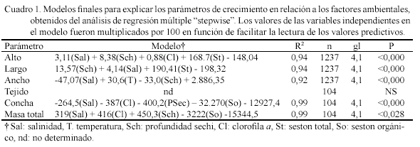 Todos los factores ambientales determinados en el experimento fueron considerados en el análisis múltiple, siendo la salinidad, la transparencia (profundidad del disco secchi), la fracción orgánica del seston y la clorofila a los factores más frecuentemente integrados en los modelos para explicar la variabilidad de los parámetros de crecimiento (Cuadro 1). La integración de todos estos factores explicó más del 90% de la variabilidad de los parámetros de crecimiento, exceptuando la masa del tejido para la cual no pudo construirse un modelo significativo. La salinidad fue el factor predictivo principal en los modelos y la temperatura solo intervino como factor para explicar el ancho de la concha. Por su parte, la clorofila a fue un factor importante para explicar la masa de la concha y la masa total de las ostras.