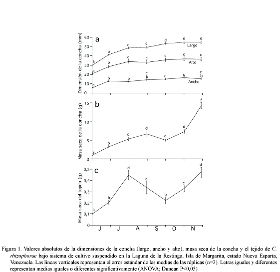 En cuanto al crecimiento se refiere, las ostras cultivadas obtuvieron un incremento de 24,7 mm en 6 meses, el cual representó 83% de la dimensión inicial de la concha con una supervivencia acumula del 53%. Este crecimiento fue alto, comparado con ostras provenientes de la misma cohorte y cultivadas en Turpialito, Golfo de Cariaco (44,6%), bajo las mismas condiciones (Villarroel et al., 2004). En contraste, el mismo crecimiento fue bajo si los comparamos con los obtenidos, también en 6 meses, por Buitriago et al. (2000), en la misma zona de estudio, donde el incremento de la concha fue 128%, mientras que el observado en Cubagua por Hernández et al. (1998) fue 189%. A diferencia del presente estudio, en los dos estudios antes mencionados los ejemplares fueron cultivados en linternas que fueron suspendidas de balsas flotantes. Por otra parte, Angell (1973) en un estudio de cultivo de C. rhizophorae, en la Laguna de La Restinga, fijadas en colectores de asbesto y suspendidas en balsa encontró mayor crecimiento que en todos los estudios anteriores (68 mm en 6 meses); sin embargo, la supervivencia fue 10%, imputando este resultado a la baja densidad de organismos por área. Lodeiros et al. (2006) en un estudio realizado para seleccionar el tipo de cesta y sistema de cultivo (long line vs. balsa), en la misma zona de estudio, determinó un mayor crecimiento en balsa y con cestas tipo linternas. La diferencia de estos estudios radica en la utilización de sistemas (balsas y long line) y recintos de cultivo diferentes (cestas, asbesto) con diferente densidad de siembra, lo cual sugiere la realización de estudios multifactoriales que contemplen diferentes densidades, diseños de cestas y sistemas de cultivo.