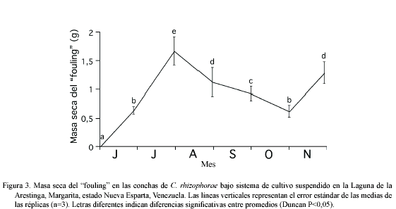 La masa seca del fouling sobre las conchas incrementó hasta finales del mes de julio con un valor de 1,67 ± 0,24 g, representando 30% de la masa total de la concha. A partir de esa fecha el fouling disminuyó significativamente (P<0,05) hasta el mes de octubre (0,62 ± 0,11 g; 8,3% del peso de la concha), para luego aumentar a 1,29 ± 0,19 g (9% de la concha) en el último mes del experimento (Figura 3).