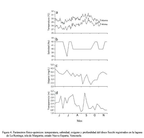 La Laguna de la Restinga es un sistema manglar cerrado que disminuye el efecto que produce la actividad periódica de los vientos alisios que generan surgencia y estratificación de la columna de agua. De esta manera, cambios de los factores ambientales como la temperatura se minimizan debido a la protección que ofrece los manglares (Monente, 1978). Nuestro estudio confirma dicha observación, ya que a pesar que la temperatura posee cierta variabilidad temporal, ésta siempre mantuvo una diferencia de solo 2°C, tanto del rango de temperatura diaria como de todo el periodo de estudio, asemejándose al comportamiento normal de poca variabilidad de zonas tropicales sin influencia de vientos. De igual manera, los otros parámetros físico-químicos como la salinidad, transparencia y oxígeno, mostraron poca variación y a pesar que en nuestro análisis de regresiones múltiples éstos factores ambientales, con excepción del oxígeno, fueron incluidos como variables principales predictivas en los modelos, los resultados indican que las variaciones acontecidas no mostraron una magnitud adecuada como para sugerir cambios en los procesos fisiológicos de moluscos bivalvos (Bernard, 1983; Griffiths y Griffiths, 1987).