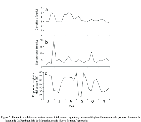 Durante todo el experimento, las temperaturas se mantuvieron siempre sobre 27°C, con un máximo de 31,6°C (Figura 4a). Entre el periodo agosto-septiembre, la temperatura fue incrementando gradualmente hasta alcanzar su máximo a finales de septiembre (31,3°C), para luego disminuir hasta el final del estudio, cuando fueron registradas temperaturas entre 28 y 29,5°C. Similares valores de temperaturas se observaron a mitad de julio. El rango de temperatura interdiaria se mantuvo generalmente con valores menores a 2°C. En cuanto a la salinidad, ésta varió en unas 4 (38-42), generalmente se mantuvo entre 40- 42, excepto en el mes de julio, cuando disminuyó a 38 debido a fuertes precipitaciones (Figura 4b). El oxígeno disuelto se mantuvo alrededor de 3,5 mg/L, presentando mínimos de 2,27 mg/L en los meses de septiembre y octubre y máximos de 4,5 mg/L a principios del experimento (Figura 4c). Por otro lado, la transparencia osciló entre 1,9 y 3,1 m, manteniéndose generalmente en 2,3 m (Figura 4d), mientras que, la clorofila a se mantuvo generalmente sobre 3 µg/L, con periodos de valores elevados (sobre el rango de 3,5-5 µg/L a mitad de junio-julio) y de finales de julio a mediados de septiembre (Figura 5a). Por último, el seston total mostró valores generalmente de 5 mg/L con maximos a finales de julio (19 mg/L) y la primera semana de octubre (11 mg/L). El porcentaje del seston orgánico se mantuvo variable entre el 20- 70%, manteniéndose en valores por encima del 60% en el mes de julio, agosto y finales de septiembre.