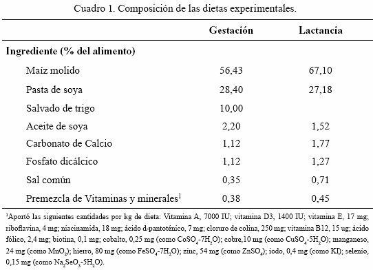 Se utilizaron 10 cerdas multíparas y dos nulíparas (Yorkshire x Landrace). En el primer caso, las cerdas fueron incluidas a la prueba después de haber destetado a sus lechones, todas las hembras fueron distribuidas a los diferentes tratamientos después de haberse inseminado y se alojaron en jaulas individuales de 0,70 x 2,10 m, con piso de cemento. Cuatro días antes de la fecha de parto y durante la lactancia, las cerdas fueron alojadas en jaulas de maternidad con rejilla plástica. Durante la gestación y lactancia dispusieron de agua fresca a libertad mediante un bebedero de chupón, colocado encima del comedero.