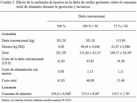 -1 de alimento a base de maíz-soya (AC), AC más follaje de morera a libre acceso (ACM) y, AC restringida a 1,5 kg d-1 más follaje de morera a libre acceso (ARM); durante la lactancia (21 d) todas las cerdas recibieron el alimento concentrado a libre acceso sin morera. El consumo de morera difirió (P<0,05) al inicio y final de la gestación con 1,8 vs. 0,95 y 1,50 vs. 1,67 kg d-1. El espesor de la grasa dorsal fue similar (P>0,05) en la gestación. El tamaño de la lechigada y el peso al nacer de los lechones no fue afectado (P>0,05) por el tipo de dieta. El peso al destete de los lechones (5,40b, 6,30a y 6,07a) y los kg destetados (38,95b, 40,55b y 46,48a) fueron diferentes (P<0,05) para AC, ACM y ARM, respectivamente. El costo de la dieta ARM fue 22,58% menor con relación a la alimentación convencional. La sustitución parcial del alimento convencional con morera es factible desde el punto de vista técnico como económico por lo que el follaje de morera representa una alternativa real en la reducción de los costos de alimentación.Palabras clave: Morus alba, cerdas gestantes, costos de producción.