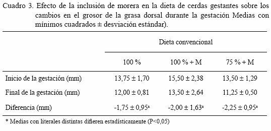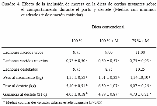 El peso al destete de los lechones fue mayor (P<0,05) en los tratamientos con morera durante la gestación, lo cual estuvo asociado a un mayor consumo de alimento (Cuadro 2) , lo que concuerda con Quesnel et al., (2009) y Veum et al., (2009), no así con Darroch et al., (2008), quienes no observaron lactancia en las cerdas que consumieron dietas altas en fibra en la gestación.