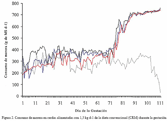 -1 para ACM y ARM. En las Figuras 1 y 2 aparece el consumo diario de morera; se puede observar que el consumo se incrementó después del d 70 de gestación en casi todas las cerdas, excepto en aquellas que gestaban mayor cantidad de fetos (alrededor del d 61) o con baja prolificidad (d 102) en ACM (Figura 1). En el grupo ARM no incrementó su consumo y disminuyó después del d 102 (Figura 2). El consumo fue similar al observado por Sarria (1994), al sustituir el 30% de la proteína de la dieta con follaje de Trichantera gigantea, en cerdas alimentadas con jugo de caña como fuente de energía, sin que se afectara el comportamiento productivo de las cerdas.El grosor de la grasa dorsal tanto de las cerdas adultas como de las primerizas fue similar (P>0,01) entre tratamientos y fue aproximadamente 2 mm menor hacia el final de la gestación (Cuadro 3), con respecto al momento de la monta. Lo que probablemente estuvo asociado a la disponibilidad de energía por la restricción alimenticia y al efecto inhibitorio de la fibra sobre la síntesis de grasa (Baer et al., 1997), dado que la alimentación con dietas ricas en fibra incrementan el flujo de nutrientes a través del tracto digestivo, no obstante, las características de la fibra influyen en la digestibilidad de la energía (Serena et al., 2008). Por su parte, Santos y Lean (2002) observaron que la ganancia total de peso en cerdas primíparas en pastoreo de la monta al destete se incrementó linealmente con el nivel de alimentación; sin embargo, las cerdas que consumieron la dieta con 19 MJ de ED d-1 mostraron pérdidas en la grasa dorsal. En contraste, Díaz et al., (2003) no observaron diferencias en el grosor de la grasa dorsal en cerdas gestantes manejadas tanto en pastoreo como en jaulas en sistemas intensivos, el cual se incrementó en 4 mm. La restricción alimenticia durante la gestación utilizando dietas basadas en granos de cereales y suplementos proteínicos como la pasta de soya corresponde aproximadamente al 50 ó 60% de la alimentación a libertad (Mroz and Tarkowski, 1991). Por lo que se ha sugerido que una de las razones del uso de la fibra durante la gestación puede estar relacionado con el incremento productivo durante la lactancia (Veum et al., 2009).