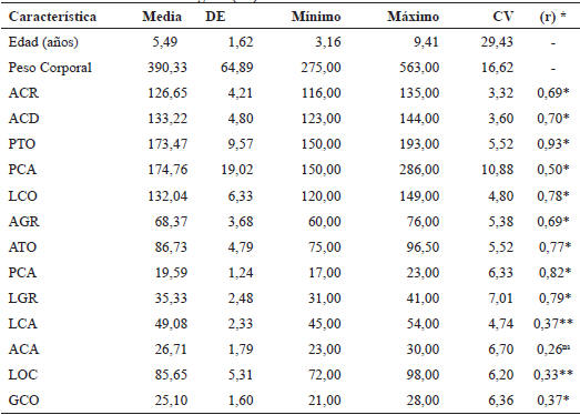 ACR: Altura a la Cruz; ACD: Altura a la cadera; PTO: Perímetro torácico; PCA: Perímetro de cadera; LCO: Longitud corporal; AGR: Ancho de grupa; ATO: Ancho de tórax; PCA: Perímetro de la caña; LGR: Longitud de la grupa; LCA: Largo de la cabeza; ACA: Ancho de cabeza; LOC: Longitud de la cola; GCO: Grosor de la cola. DE: Desviación estándar; CV: Coefi ciente de variación; r: Correlación fenotípica. *:P<0,001. **:P<0,05 ns: no significativo