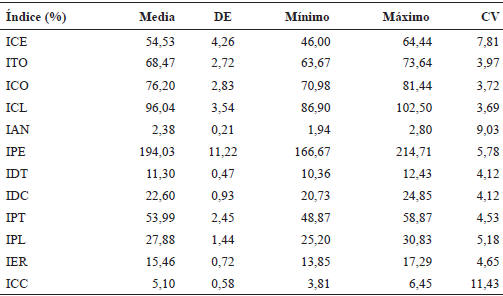 ICE: Índice Cefálico; ITO: Índice Torácico, ICO: Índice Corporal; ICL: Índice Corporal lateral; IAN: Índice de Anamorfosis, IPE: Índice Pelviano; IDT: Índice Dáctilo-torácico; IDC: Índice Dáctilo-costal; IPT: Índice Pelviano Transversal; IPL: Índice Pelviano longitudinal; IER: Índice Espesor relativo de la caña; ICC: Índice Carga de la Caña. DE: Desviación estándar; CV: Coeficiente de variación.