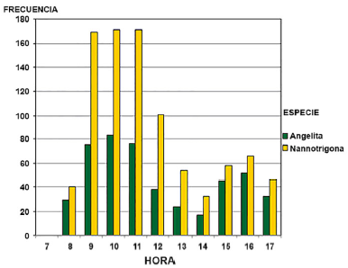 Figura 1. Frecuencia de pecoreo de angelita y nannotrigona en pepino en invernadero cerrado.