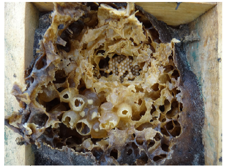 También se observó que muchas abejas murieron (Figura 4) por efecto de los agroquímicos aplicados, aun cuando las abejas fuesen retiradas al momento de la aplicación en las tardes y el producto teóricamente era inocuo para los insectos, todo ello indica que estos agroquímicos son tóxicos para las mismas. Lo que demuestra que las abejas deben ser retiradas al menos tres días después de la aplicación de agroquímicos y los mismos deben evitar el contacto con las flores, porque las contaminan, originando que el polen y néctar sean tóxicos para las abejas, tal como lo señalan Nicodemo y Nogueira-Couto (2004), Malerbo-Souza y Nogueira-Couto (1998) quienes también recomiendan la utilización adecuada de los agroquímicos y participar anticipadamente a los apicultores para retirar las colonias, agregando que existen sustancias repelentes a las abejas, que pudieran ser añadidos a los agroquímicos, para repeler a las abejas por un tiempo determinado después de la aplicación de los mismos.