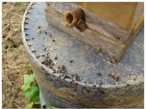 Figura 4. Meliponinos muertos por acción de agroquímicos en la entrada de la piquera.