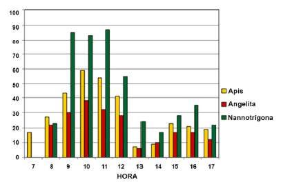 En el presente trabajo, tal como se muestra en la Figura 1, ambas especies visitaron principalmente las flores de pepino, durante casi todo el día, con colecta de néctar de esta planta verificado, entre las 7.00 y 17.00 horas, con un máximo entre las 9.00 y las 11.00 concordando con los datos de Nicodemo (2008) quien observó este comportamiento colector en N. testaceicornis. A pesar de lo dicho, el polen lo colectaban desde 10.00 hasta 12.00 horas y entre 14.00 y 15.00 horas, contrario a lo sugerido por el mismo autor, quien señala que ninguna de las abejas evaluadas colectó polen de pepino, aunque verificó que las abejas tuvieron contacto con los estambres, presumiendo que las abejas durante la colecta de néctar impregnaban su cuerpo de polen y lo transportaban a otras flores cuando estaban pecoreando néctar. Las angelitas colectaban néctar y polen, este último principalmente, después de las 14.00 horas.