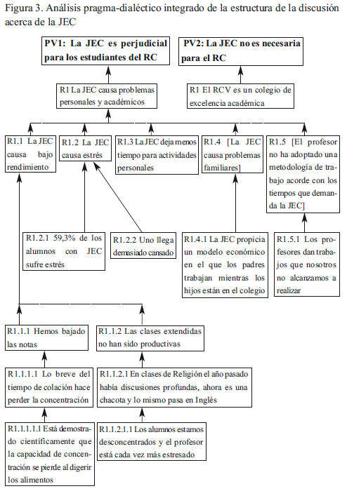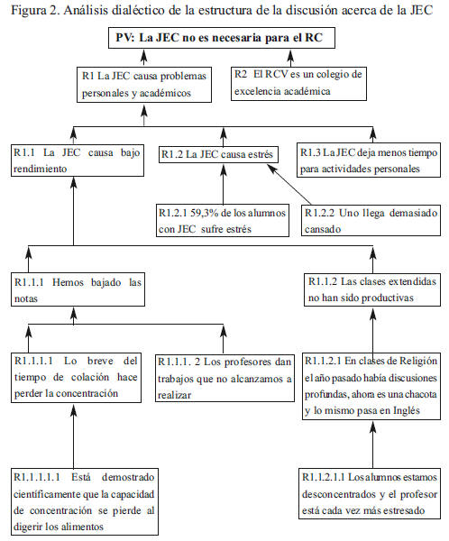 En la etapa de argumentación, cuya estructura se representa en la Figura 2, observamos que la discusión es de tipo múltiple con subargumentaciones que se desprenden de dos razones (R1 y R2): La JEC causa problemas personales y académicos y La JEC no es necesaria para el RC. De estas dos razones, sólo la primera da cabida a varias subargumentaciones, en tanto que la segunda tiene sólo una subargumentación El RC es un colegio de excelencia académica que representa una argumentación sintomática, esto es, que se asocia a una imagen (la excelencia académica) del objeto de la discusión (el colegio RC).