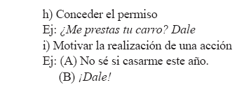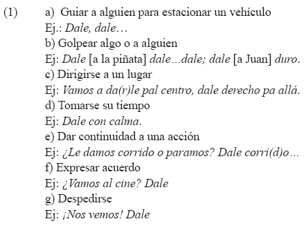 Es relevante señalar que las opciones anteriormente indicadas sobre el significado de la expresión concuerdan con algunos de los significados observados para el verbo dar (expresar acuerdo, despedirse y conceder permiso) cuando éste se utiliza sin la conjunción pues. Lo anterior podría interpretarse como que la expresión dale pues constituye una forma expresiva más elaborada, que hace uso de la conjunción pues como un enfatizador que acompaña al verbo (como lo señala susan Ervin-Tripp 1986) en ciertos actos directivos, como los imperativos. En este sentido, serán muy probablemente el contexto pragmático y la fuerza elocutiva del interlocutor los encargados de precisar tanto la forma significante a utilizar como el significado a remitir.