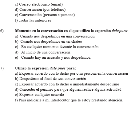 Los resultados obtenidos para (6b) y (6d) también proporcionan información relevante. del porcentaje de (6b), 2,94%, se puede deducir, por un lado, que dale pues se usa raramente en la lengua escrita (en este caso cuando se chatea), y por otro que, cuando se llega a utilizar en la escritura, es a modo de despedida. Este resultado, unido al de (6a), indica que dale pues cumple un importante papel como finalizador, aunque lo haga sobre todo en la conversación. La ausencia de respuestas en (6d) indica que dale pues parece no usarse nunca para iniciar una conversación.