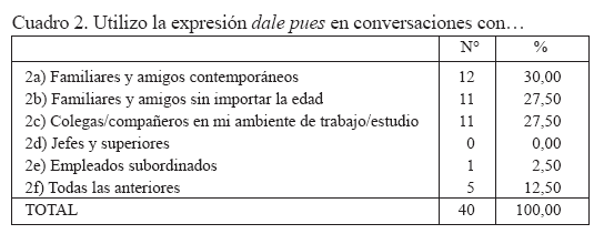 En el cuadro 2 se ofrecen los resultados relativos al tipo de interlocutores con los que regularmente se utiliza la expresión: