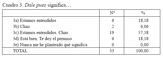 En el cuadro 3 se muestran los resultados relativos al planteamiento acerca del significado atribuido a dale pues por las personas encuestadas: