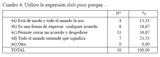 En el cuadro 4 se ofrecen los resultados relativos a la razón por la cual los hablantes utilizan el marcador dale pues: