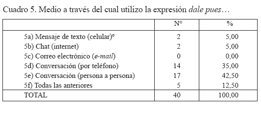 La selección de la opción (4a) pareciera indicarnos que la expresión es de uso habitual entre los venezolanos y que, además, ofrece un significado conocido, como lo expresan los datos obtenidos en la opción (3d). Veamos ahora en el cuadro 5 los resultados relacionados con el medio en el que se usa dale pues: