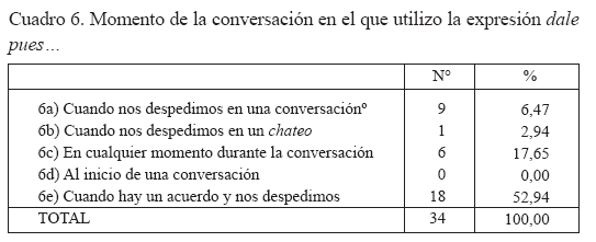 Los datos observados en el cuadro anterior indican que la expresión dale pues es un marcador del discurso oral espontáneo, pues se prefiere utilizar en situaciones comunicativas que se dan en forma inmediata y no diferida, y donde los procesos cognitivos de formulación y enunciación ocurren al mismo tiempo, lo cual corrobora lo planteado por Calsamiglia y Tusón sobre la naturaleza de los marcadores del discurso espontáneo. En el cuadro 6 se muestran los resultados correspondientes al momento de la conversación en que es utilizada la expresión bajo estudio: