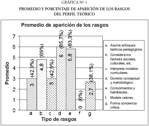 Se observa que los rasgos «d» y «e» presentan promedios de aparición alto (85,7% y 83,3%). En relación con los rasgos «a», «b», «c» y «g», se observa que presentan promedios de aparición intermedio (42,9%, 69%, 42,9% y 38,1%). El rasgo «f» presenta un promedio de aparición nulo. Estos resultados, que expresan una preponderancia del rasgo «adecuado dominio conceptual y procedimental de su área especifica de conocimiento» y «conocimientos y habilidades que le permiten articular las diferentes variables o componentes de las situaciones de aula configurando procesos educativos que atiendan a los aspectos teóricos, metodológicos, técnicos y éticos», coincide de manera importante con datos revelados por los trabajos de Bravo et al (2000a, 2000b) relacionados con estudios de los programas de las seis (6) instituciones formadoras de docentes de la Zona Metropolitana del país, y con el desempeño de profesores graduados en esas instituciones. Bravo et al (2000a) afirman, en relación con la formación de profesores, que: