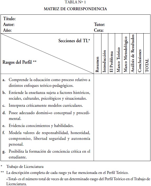 Nuestro trabajo de investigación está compuesto por tres partes, las cuales nos permiten describir los procedimientos y métodos utilizados. En la primera parte se establecen los elementos del Trabajo de Licenciatura que nos permiten utilizar a dicho trabajo como medio de información para develar el perfil del egresado del CCFD. En este sentido, los elementos que utilizamos para la investigación son: Resumen, Introducción, El Problema, Marco Teórico, Marco Metodológico, Análisis de Resultados, Conclusiones. Estos son las secciones en las cuales está estructurada la mayor parte de los Trabajos de Licenciatura. En la segunda parte, se relaciona el Trabajo de Licenciatura con el Perfil Teórico. Esta relación se establece por medio de una «Matriz de Correspondencia» (ver tabla Nº 1) en la que se vinculan los siete elementos estructurales del primero (Secciones del TL) con las categorías definidas por el segundo (Rasgos del Perfil). Esto implica que en una misma Sección del TL se pueden producir relaciones con varios Rasgos de Perfil y viceversa, varios Rasgos de Perfil pueden estar en una misma Sección. Además, se tienen los datos principales de cada Trabajo de Licenciatura como lo son: título, autor, tutor, fecha y cota. Y en cada Matriz también se presenta una casilla denominada «Total», la cual se utiliza para representar el número de veces que aparece un determinado rasgo en cada TL.