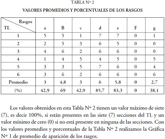 Los valores obtenidos en esta Tabla Nº 2 tienen un valor máximo de siete (7), es decir 100%, si están presentes en las siete (7) secciones del TL y un valor mínimo de cero (0) si no está presente en ninguna de las secciones. Con los valores promedios y porcentuales de la Tabla Nº 2 realizamos la Gráfica Nº 1 de promedio de aparición de los rasgos.