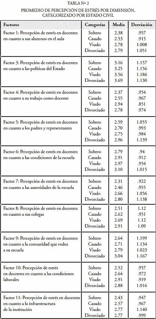 Los resultados evidencian que los niveles más altos de percepción de agentes altamente estresores los presentan los docentes que se identificaron como «divorciados»; esto ocurrió en todas las dimensiones, salvo los factores 4 y 10, donde los promedios significativamente más altos se observaron en el grupo correspondiente a los viudos, con resultados de 2.94 y 2.91 respectivamente. El grupo de divorciados del factor 3 correspondiente a la percepción de estrés en docentes en cuanto a «las políticas del Estado sobre educación» obtuvieron el promedio de percepción de estrés más alto con 3.69. Si se analiza el grupo de la categoría que presentó menores niveles de percepción de es trés, se observa que los «solteros» son los menos preocupados en todos los factores. El mínimo observado se presentó en el factor 7 correspondiente a la percepción, como agente estresor, «de las autoridades de la escuela» con un promedio de 2.31.