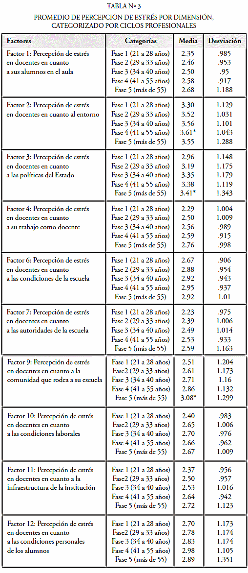 En función de esta distribución cronológica de la vida profesional del docente se basa el estudio del promedio de percepción de los estresores categorizados por ciclos profesionales. En la Tabla Nº 3 se presenta la media y la desviación que obtuvo cada factor, discriminados por ciclos profesionales.