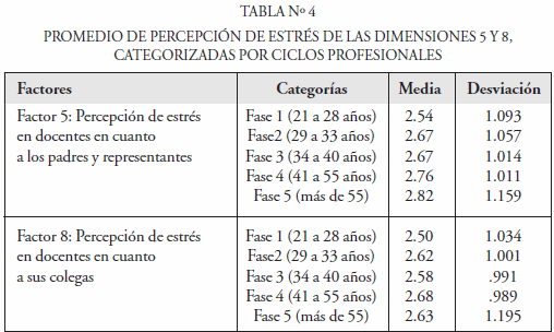 Al estudiar la existencia de diferencias significativas entre los grupos en el caso de la variable «ciclos profesionales», el ANOVA arrojó que los factores 5 y 8, correspondientes a percepción de «los padres y representantes» y «a sus colegas» como agentes estresores, no presentan diferencias significativas entre los ciclos profesionales. Sin embargo, como era de esperarse, los grupos que identifican a estos factores como altamente estresores corresponden a las fases 4 y 5, o los de mayor edad. Este mismo grupo de edad percibió a los factores «entorno» y «políticas del Estado», con magnitudes de 3.61 y 3.41 respectivamente. Los niveles más bajos se perciben en los más jóvenes y esto su cede en todos los factores. Sin embargo eso no significa que este grupo no perciba como agentes altamente estresores a áreas consideradas críticas, ya que en factores como «el entorno de la escuela» y las «políticas del Estado» las magnitudes obtenidas son de 3.30 y 2.96 respectivamente. Es importante resaltar que los jóvenes presentan los más bajos niveles de percepción como estresores a «los alumnos en el aula», «el trabajo como docente» y «las autoridades de la institución»; con valores de 2.35; 2.29 y 2.23 respectivamente.
