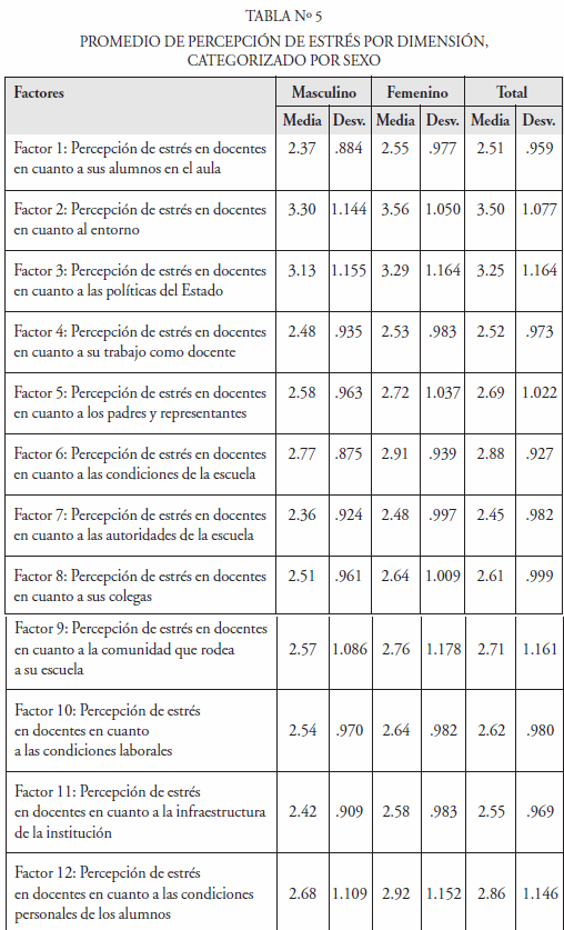 Como se puede observar, los mayores promedios de percepción de estresores se evidencian en los factores 2, 3 y 6, relacionadas con el «entorno de la escuela» (promedio de 3.52), las «políticas del Estado sobre educación» y «las condiciones de la escuela». En contraparte, los promedios más bajos corresponden a los factores 7, 1 y 4, que aluden a «las autoridades de la escuela» (pro medio de 2.43), «sus alumnos en el aula» (promedio de 2.50) y el referido a «su trabajo como docente» (promedio de 2.51). Basados en los resultados obtenidos, pareciera que a los docentes les preocupara más la situación so cial del país, las políticas del Estado sobre el área educativa y las condiciones de la escuela, que lo concerniente a su trabajo como docente, su relación con las autoridades de la institución, o sus alumnos en el aula.
