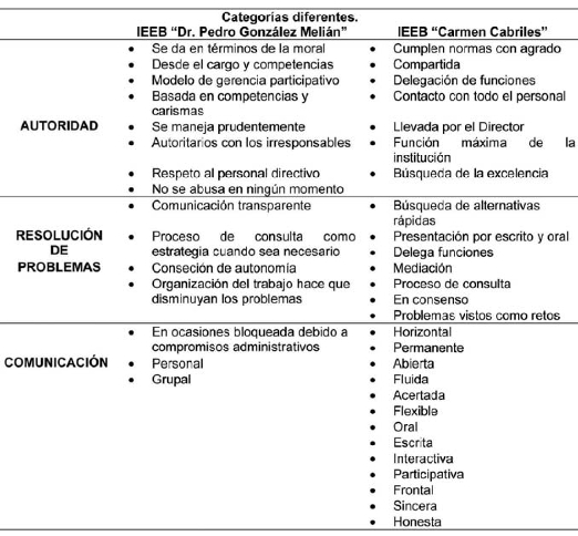 En cuanto al indicador autoridad, el IEEB Dr. Pedro González Melián, lo conceptualiza como un modelo de gerencia participativa, basada en competencias y carisma, se maneja con prudencia y se da en términos de cumplimiento de la moral, a diferencia del IEEB Carmen Cabriles, que lo define como funciones propias del director, delegando responsabilidades en el personal, es un proceso compartido y trata de hacer cumplir las normas con buena aceptación por el personal.
