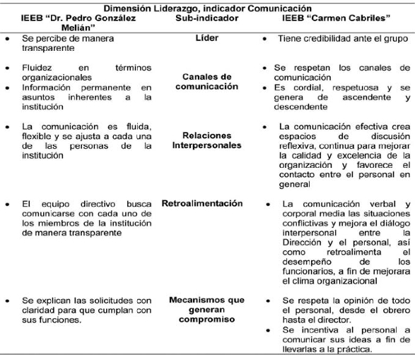 En relación al indicador comunicación en el IEEB Dr. Pedro Gnzález Melián, señalan, que la comunicación se percibe como un proceso transparente, de información permanente, fluida, flexible y se ajusta a cada una de las personas de la organización, en tanto que el IEEB Carmen Cabriles, sustantiviza a la comunicación como un proceso efectivo donde se crean espacios de discusión y reflexión para la mejora de la calidad de la organización, también acotan que a través de los canales de comunicación se retroalimenta el desempeño de los funcionarios, para optimizar el clima organizacional.