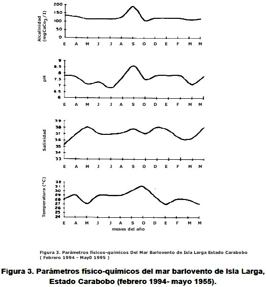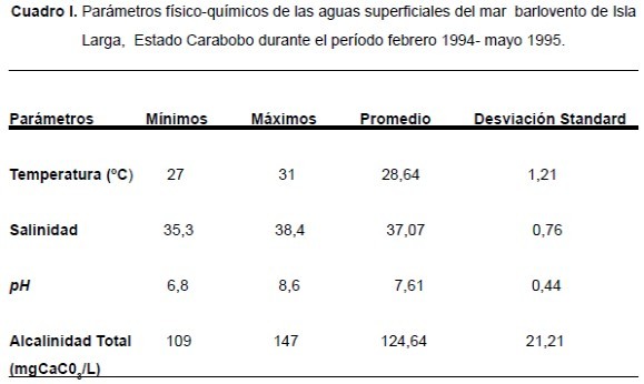 En el Cuadro 1 se presentan los valores promedios obtenidos para los parámetros físico-químicos analizados en la costa barlovento de Isla Larga para el período febrero 1994-mayo 1995. En la fi gura Nº 3 los valores de temperatura del agua presentan un mínimo de 27ºC para mayo de 1994 y 1995 e igualmente para enero de 1995. Estos valores de temperatura en las aguas superficiales coinciden con los máximos de salinidad de 38 para los meses de mayo 1994 y 1995 existiendo otro máximo de salinidad para enero de 1995. Los datos obtenidos para estos dos parámetros caracterizan condiciones de surgencia local para esta área de Golfo Triste. En el segundo semestre del año la temperatura del agua se incrementa hasta 31°C en estas aguas superficiales y las salinidades pueden alcanzar mínimos de hasta 35,8. Voltolina (1978) y Ginés (1982) consideran que en Golfo Triste las masas de agua son cálidas tanto superficialmente como en el fondo debido al aislamiento hidrodinámico por masas frías de surgencia ubicadas al norte que frenan su circulación. En los afloramientos costeros del litoral central de Venezuela dominan aguas de 22°C hasta 27°C según (Ginés, 1982); encontrándose los mínimos valores de temperatura superficial del agua en el presente estudio dentro del rango señalado anteriormente.
