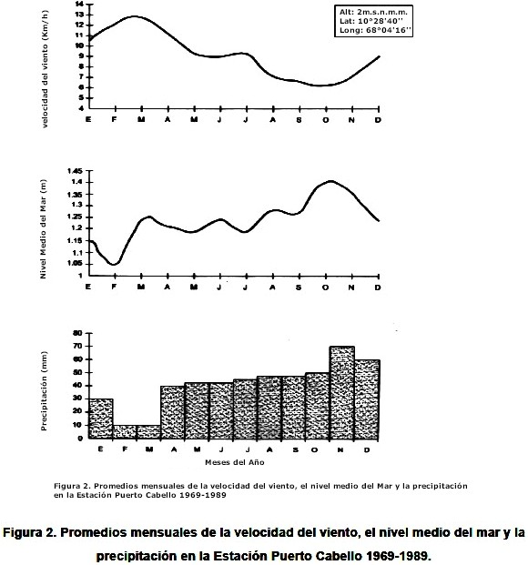 El ritmo de mareas se estimó a partir de los boletines sobre el Pronóstico de las Mareas para los años 1993 y 1994 (MARNR) para la estación La Guaira (latitud 10° 37´N longitud 66° 56¨W). Se determinó el promedio anual de las mareas (Figura 3).