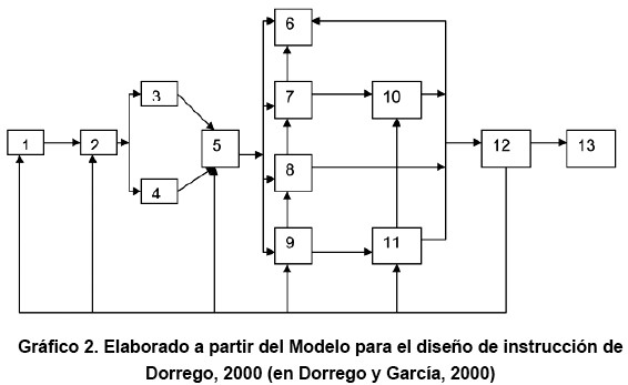 No es la intención de este trabajo revisar con detenimiento como opera dicho modelo, ya que ese aspecto es del dominio de todo aquel iniciado en el tópico. La intención de su presentación reside en contrastarlo con la propuesta de Dorrego, 2000 (en Dorrego y García, 2000) en cuanto al desarrollo de materiales instruccionales electrónicos; al respecto, la autora sugiere partir de un modelo de diseño de instrucción, el cual es esquematizado de la siguiente manera: