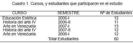 Como se ha señalado, el contexto en el cual se desenvuelve la investigación es el Departamento de Arte del Instituto Pedagógico de Caracas, donde se llevó a cabo diversas actividades en los cursos seleccionados, con la finalidad de observar la relación entre los procesos educativos y los espacios de la información y la comunicación a los que se ha hecho referencia, específicamente entre los estudiantes de esta especialidad.